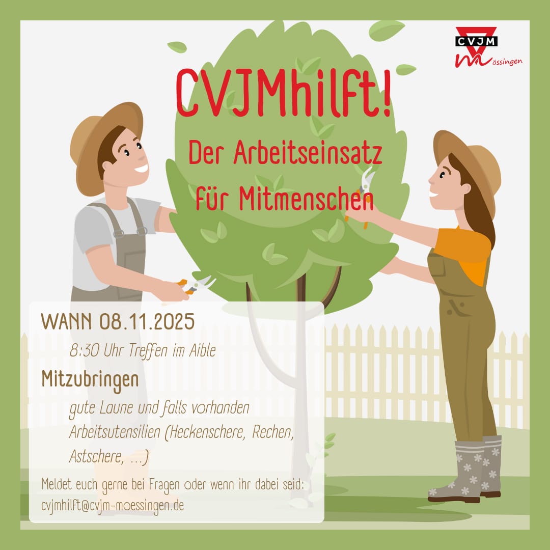 „CVJMhilft" unter diesem Schlagwort findet dieses Jahr am Samstag, 08.11.2025 zum dritten Mal ein Arbeitseinsatz für Mössingen statt. Wir wollen den Menschen in Mössingen helfen, indem wir ganz praktische Unterstützung “rund ums Haus” anbieten.