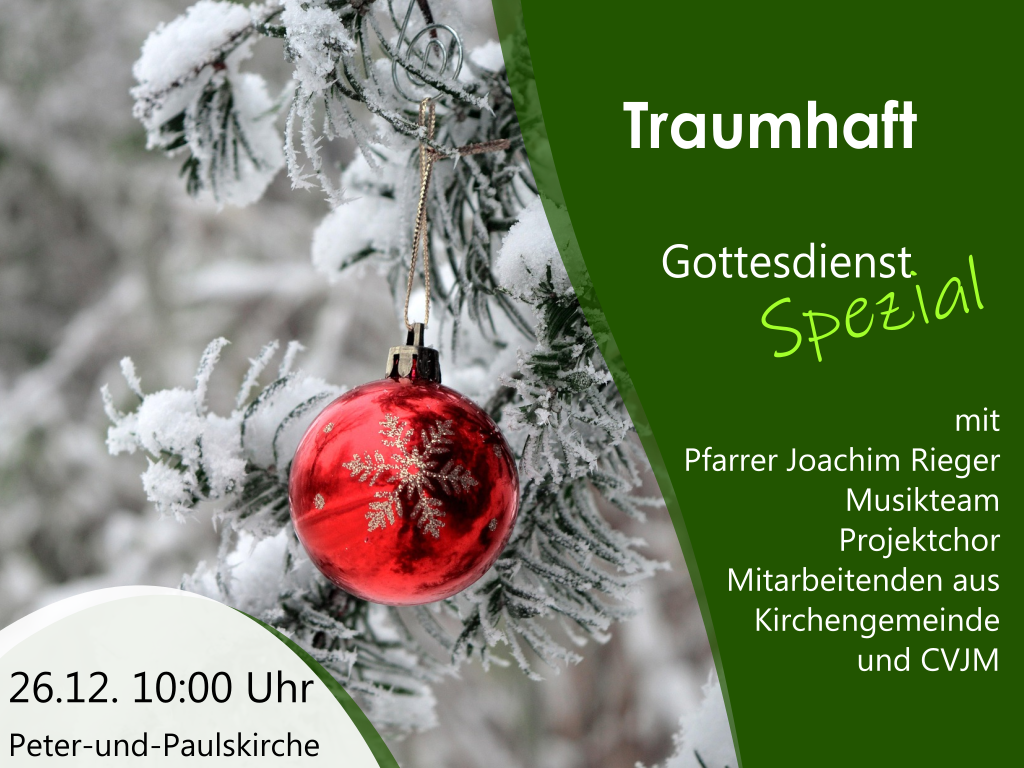 Herzliche Einladung zum Gottesdienst Spezial am 26.12.2025 um 10:00 Uhr in der Peter-und-Paulskirche. Thematisch geht es um den Traum des sich hintergangen fühlenden Josef. Musikteam mit Projektchor und Mitarbeitende aus der Kirchengemeinde und aus dem CVJM gestalten den Gottesdienst mit.